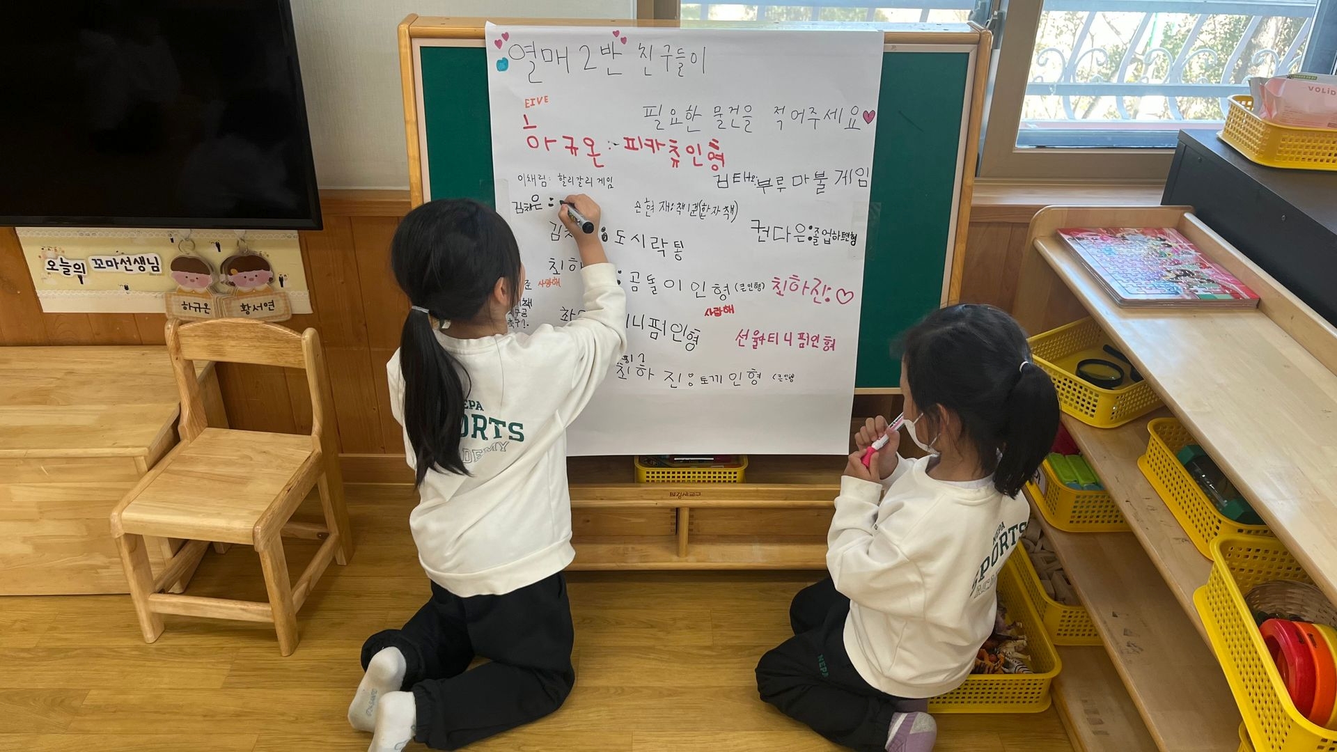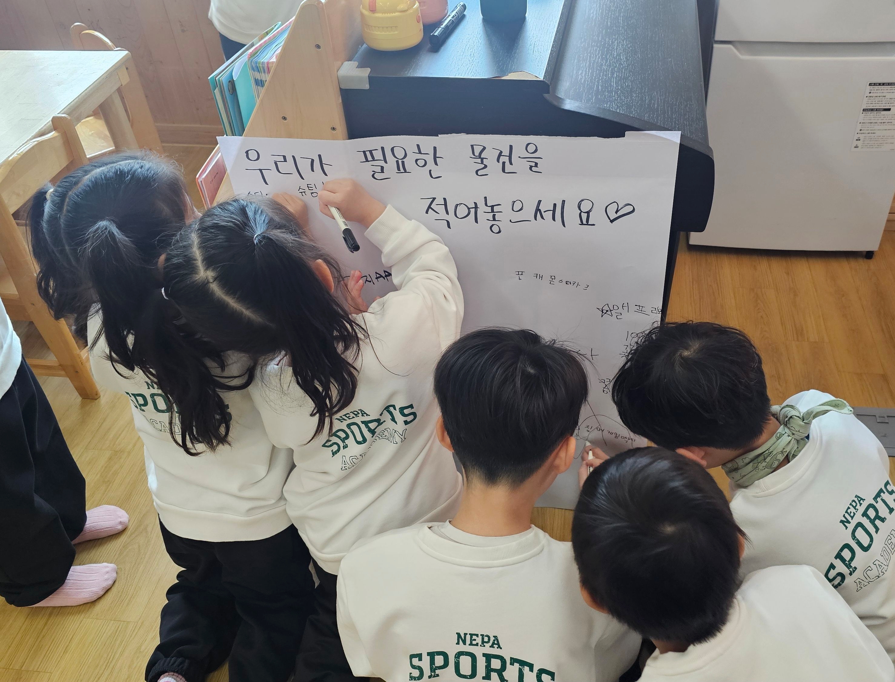 유아들끼리 토론을 통해 필요한 물건을 정하고, 기록해 두면